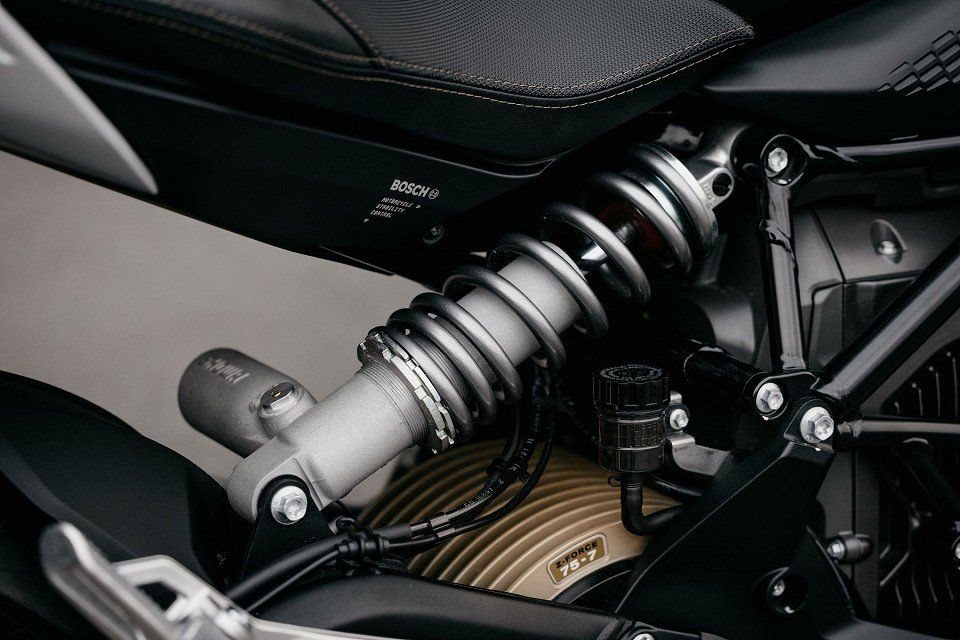 - Showa-Gasdruck Stoßdämpfer, Kolben 40 mm, mit fixiertem, extern Reservoir, Federvorspannung, Druck- und Zugstufe einstellbar
